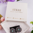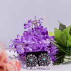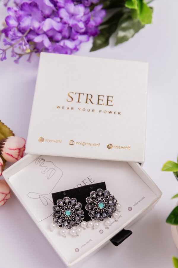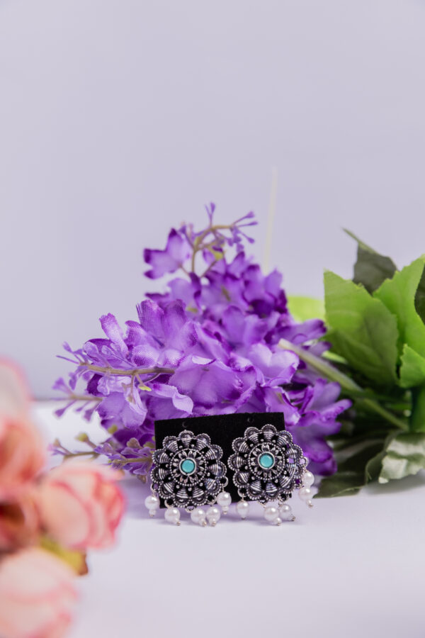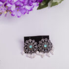Classic circular studs highlighted by a turquoise center stone and a neat line of pearl drops. Lightweight elegance for office wear and small gatherings.