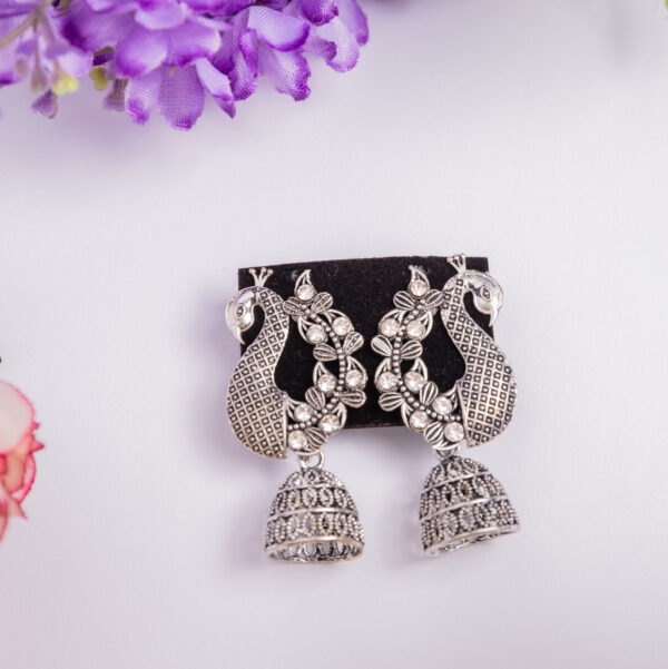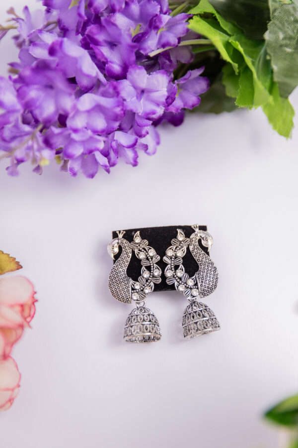 Intricately carved twin peacocks encircle a floral vine, dropping into patterned jhumkas for a regal finish. A statement heritage piece for weddings and festive occasions.